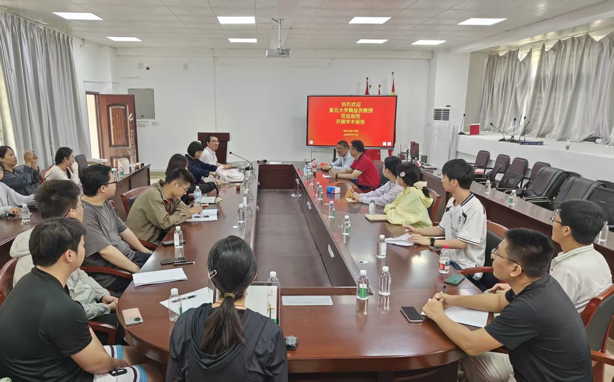 应我校数学与统计学院和科学技术院邀请,复旦大学数学科学学院魏益民教授于2026年4月10日上午为学院师生作题为“Moore-Penrose逆、最小二乘、总体最小二乘、矩阵方程及Tikhonov正则化问题的条件数”的学术报告。报告会由数学与统计学院副院长严可颂主持,学院部分教师及研究生参加了本次活动。